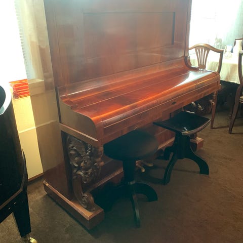 1800 luvun loppupuolella, G & E Kanhäuser, Stuttgart, taffelipiano, joka ollut mm Viipurin maaherran Arvo Mannerin kartanossa. Arvo Manner oli kova musiikkimies. Muuton alta myymme tämän kaunistuksen, yksi kosmeettinen vika on kannen alla, siitä kuva. Lähes vireessä.