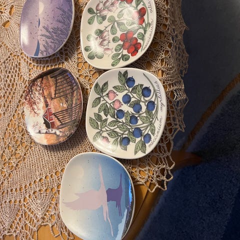 Kaikki hyvä kuntoisia. Hinnat erikseeb ostettuna: isot matalat lautaset 60e, syvä iso lautanen 15 e, kaikki 6+2 salaatti/voileipälautasta 90e, sillilautanen 20e. Koko jäljellä oleva erä yhteishintan 130e.