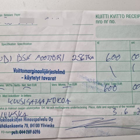 Audi a3 1.8 BENSA. Myydään osina tai kokonaisena. Auto ruotsin rek. Teknisesti hyvä ja vähän ajettu 209589km. Hinta 10-600e. Moottori ja vaihteisto apulaittein 350€ Ajokuntoinen. P. 046 5844103