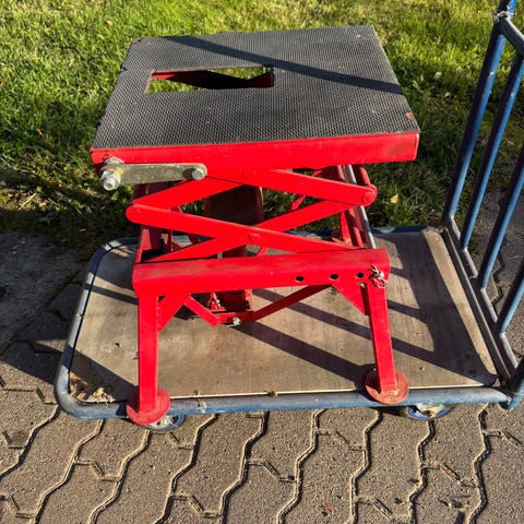 Kätevä dolly pyörän siirtelyyn. Kantavuus 250 kiloa. Pituus noin 2 metriä ja seisontatuen kohdalla leveys 60 senttiä.