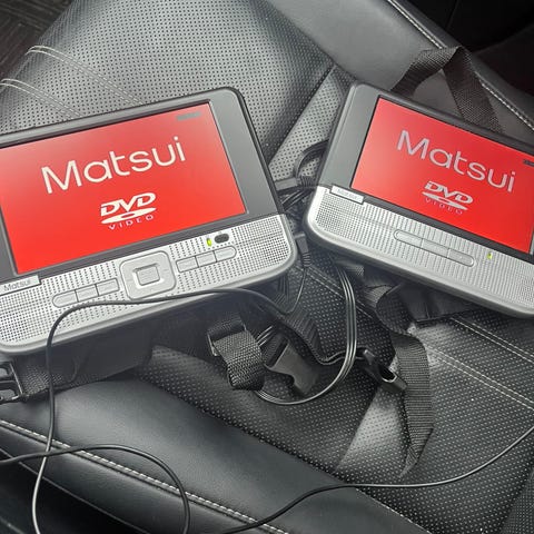 Toimiva DVD soitin lisä näytöllä, kaukosäädin, nauha kiinnitys niskatukeen, auto pistoke ja yhdistämispiuha toiselle näytölle, USB tikulle sekä kuulokkeille liitännät.