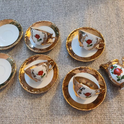 Pienet kupit, 4 kpl, sokerikko kannella, kermakko ja kahvi- tai teekannu. Kolme valkoista pikkulautasta. Maisemateema kuviona. Ei leimoja.