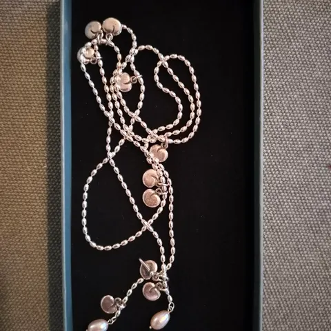 Kaksi pientä sydämenmuotoinen hopealehdykkää ja vaaleanpunainen makeanveden helmi sulostuttavat siroa Vanamo-riipusta, joka sopii kaikenikäisille tytöille ja naisille. Pituus 42cm. Papukaijalukko.