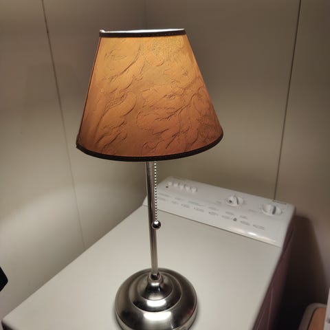 Pöytälamppu, korkeus 66 cm varjostimen kanssa. Lampunvarjostimen halkaisija 34 cm. Kolme max 40 w lamppua. Johdossa ei erillistä katkaisijaa.