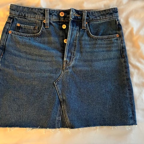 Farkkuminihame merkiltään Kone Helsinki. Koko 38. 100 % puuvillaa. Takana ja sivuilla taskut. Edessä nappikiinnitys.