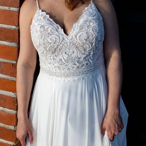 Ihana pitsinen yläosa ommeltu mekkoon erikseen, joten sen voi halutessaan poistaa. Pukupussi kuuluu hintaan. Mekko on pesulassa pesetetty heti käytön jälkeen.