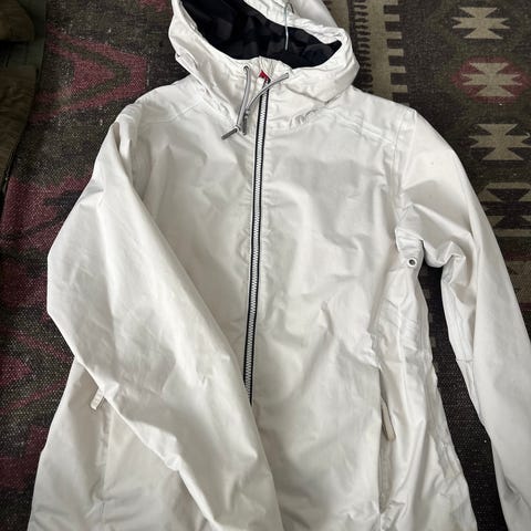 Helly Hansenin kiva valko-tummansiniraidallinen sään kestävä takki pinkeillä yksityiskohdilla. Huppu irroitettava neppareilla, vetoketjutaskut, verkkovuori, helmassa kiristysnyöri. Paljon käytetty mutta todella siisti ja hyväkuntoinen ja ehjä. Ihan pikkuisen tummentumaa hihansuissa sisäpuolella rypytyksissä kun niitä venyttää joten täysin näkymättömät ulospäin. Kivan raikas takki ja valkoinen on edelleen kirkas valkoinen. Takki senttikoossa 176, mielestäni vastaa S kokoa.