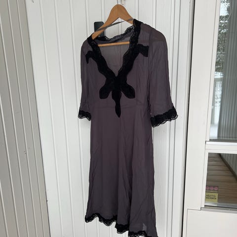 Vintage-mekko paksua harmaata samettia, tilkkutyötä ja kirjailuja, pystykaulus, XS-koko. Kai-kai 42 cm, vyötärön leveys 35 cm, olka-helmapituus 128 cm. Vuorikangas, takana vetoketju. Helmaosassa muutama pieni ruskea tahra.