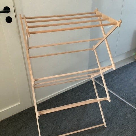 Ripustettava / riippuva kuivausteline, 20 pyykkipoikaa. Materiaaleina puu (koivu), juutti (narut), ja bambu (kehikot). Täysin muoviton, eikä kokoamisessa ole käytetty liimaa, eli jos jokin osa hajoaa, sen pystyy helpohkosti korvaamaan uudella, kaikkia osia on yleisesti saatavilla tavallisista marketeista.