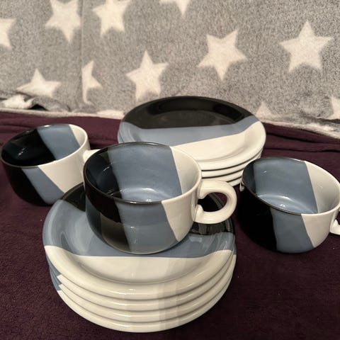 4 kahvikuppia, aluslautasta ja leipälautasta. Tumman ruskeat.