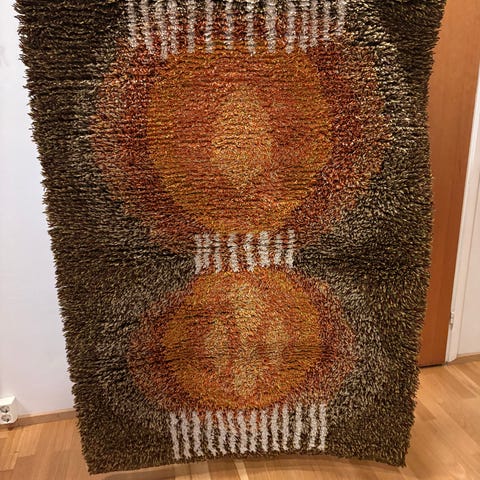 Pun. pitkänukkainen kangaspuissa kudottu ryijy, koko 113 x 190 cm