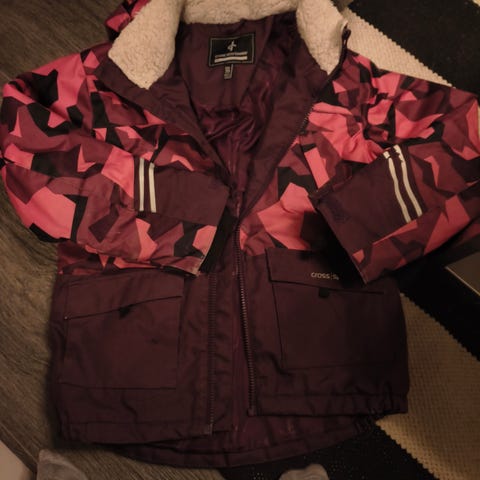 Lämmin toppatakki, koko 134. Kiristysnyöri helmassa. Irrotettava huppu.
