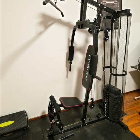 Kuntosalilaite sisältää painopakan ja erilaisia harjoitusmahdollisuuksia.