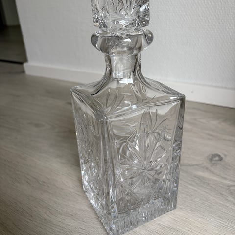 Virheetön kristallikarahvi, jonka korkeus n. 33,5 cm, pohjan ø n. 7,5 cm ja paino 1,482 kg
