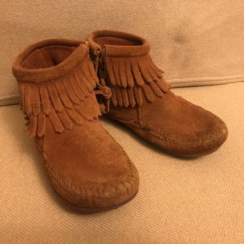 Laadukkaat nahkaiset mokkasiinit, koko n. 27, sisämitta 17 cm. Merkki Minnetonka.