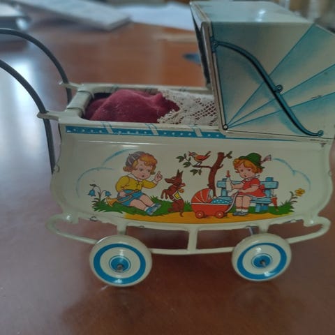 Uniikki puinen lasten vetoaisallinen lelu 1930- luvulta, mukaan kyydissä tulee nallepari.