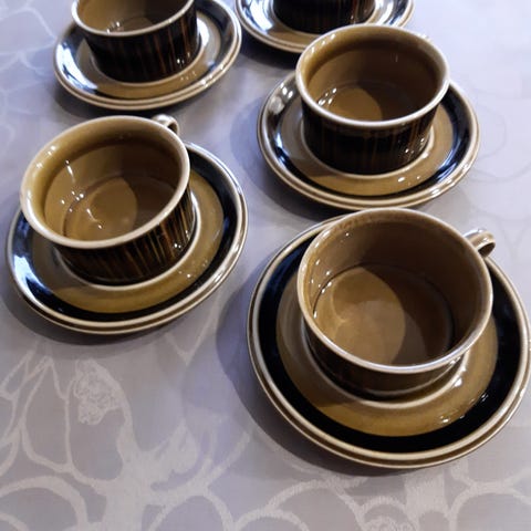 6 kpl Arabia pikkulautasia/tasseja, piippuleima 10€/kpl.