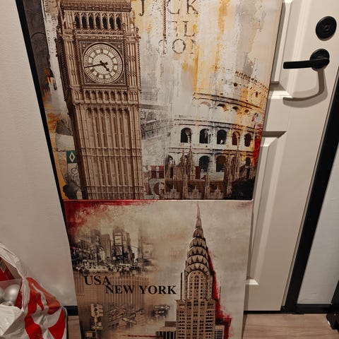 Kaksi isoa sisustustaulua / julistetaulua 51x72cm. Valkoiset puukehykset. Mieluiten nouto, mutta toridiilinä voin myös postittaa. Eivät löytäneet meillä paikkaa uudessa kodissa siksi myyntiin.