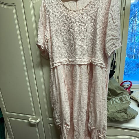 Bypias Bohemiana pellavainen mekko, joka todella upea päällä :) 100% luonnonvalkoista pellavaa. Onesize. Kauniit mesh-pitsikoristeet mekon reunassa edestä lyhyempi, takaa pidempi. Tämä on kesän 2024 mallistosta ja myytiin loppuun nopeasti. Kerran päällä käynyt. Tämän kuuluu olla väljä, mutta omaan makuuni itselleni turhan reilu. Ryppyinen, kuten pellavan kuulukin :) Maksoin tästä 129,-
