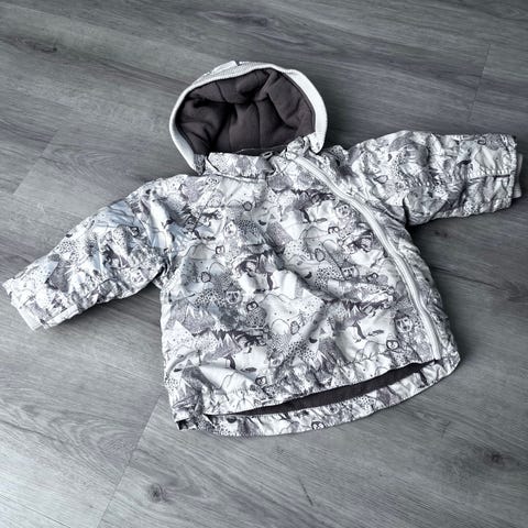 Ehjä ja siisti takki. Huppu kateissa. Nukkaa, muuten ei moitetta. Koko 86cm /12-18kk