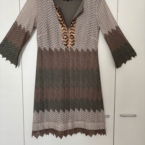Myydään itse ommeltu a-linjainen mekko. Miehusta on varsinaisesti verhokangasta ja hihat trikoota. Takana vetoketju. Pituus olalta helmaan n. 89 cm. Jonkin verran kulumaa ja haalistumaa kuvioissa, mekkoa on paljon pidetty, mutta ei enää mahdu päälle. MMM.