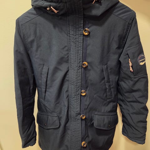 Laadukas, lämmin ja edelleen siisti talviparka. Hupun karvareunus puuttuu ja hupun toisen kiristysmekanismin nauha on rikki, mutta toimii. Hyväkuntoinen käytetty.