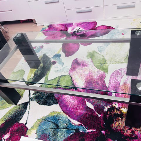 Kolmitasoinen lasinen musta sohvapöytä. Hyllyjen väli 15,5 cm.