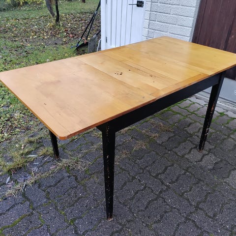 Kaunis ovaalin muotoinen puupöytä kolmella 45cm jatkopalalla. Jatkopalat maalaamattomia. Pituus ilman jatkopaloa 130cm. Pöytä on jämäkkä ja painava