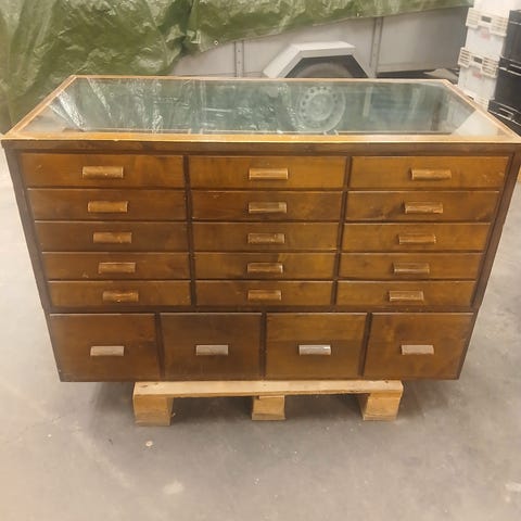 Makee Stokkan vanha myymäläkaluste..painaa ku synti..molemmin puolin 6 laatikkoa ja 3 ulosvedettävää tasoa..alaosa 180x90x90..ylätaso 135x45,alla valot..mahtuu aikalailla tavaraa..alla pyörät helpottaa siirtelyä..keräily,vitriini,myyntipöytä,lasivitriini,keräilyesine,myyntitiski..