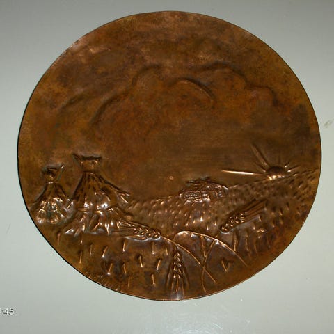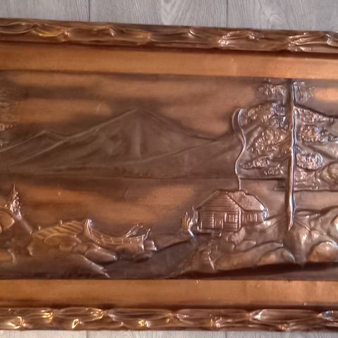 Itse (kauan sitten) tehty kuparipakotustyö, jonka mallina käytetty Erkki Tantun piirrosta. Koko 31 x 33 cm. Takana ripustin. Hakusanat: kupari, piirros, taulu, taide