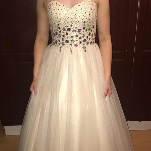 Kaunis ja klassinen vanhojentanssimekko. Yhdet tanssit tanssittu viime talvena. Ostettu uutena Zazabellasta Oulusta. Tanssija 164 cm pitkä ja tanssikenkinä oli tennarit.