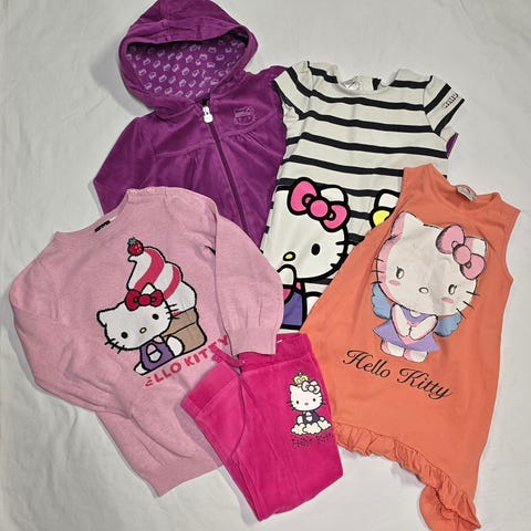 Kuva 3: 2 x collegepusero (Minni uudehko), pörröpusero, velourtakki HelloKitty