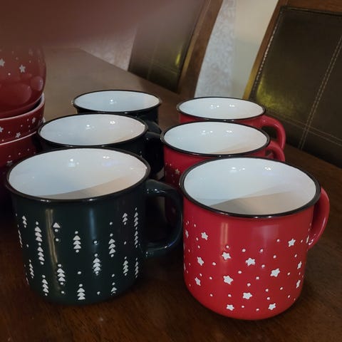Jouluiset punaiset astiat. Isommat lautaset 24cm 3kpl. Lautaset 21cm 5kpl. Pieni lautanen 18cm 1kpl. Kuppi 12cm 1kpl. Vati 24cm 1kpl.punaiset kahvikupit 6kpl.