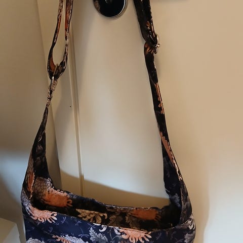 Pieni olkalukku satiinityyppisestä kankaasta, mikä päällystetty pienistä mustista helmistä tehdyllä verkkopunoksella. Vetoketjukiinnitys. Kaunis, yksilöllinen laukku.