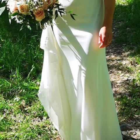 Olen noin 162cm pitkä ja puku on minulle lyhennetty. Jalassa minulla oli hääpäivänä n. 4cm korot.