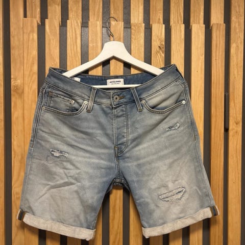 Jack & Jones merkkiset miesten farkkushortsit. Shortsit, joiden koko S. Regular fit. Revitty housujen malli. Vaaleansininen liukuvärjätty väri. Hyväkuntoinen. Taskut on edessä ja takana. Sepaluksissa on nappikiinnitys. Kivat pienen miehen housut kesäksi.
