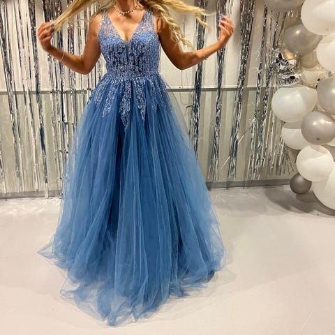 Vaaleansininen kimalteleva vanhojentanssimekko.