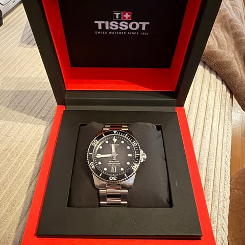 Myydään vähälle käytölle jäänyt Tissot automaattikello. 300m vesitiivis eli Itämerellä voi käydä pohjalla melkein joka paikassa. Ranneke jotain kumia. Takana pieniä käytön jälkiä.