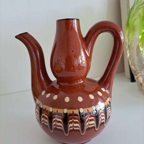 Velkualla valmistettu kokonaisuus. Kannu ja alusta.