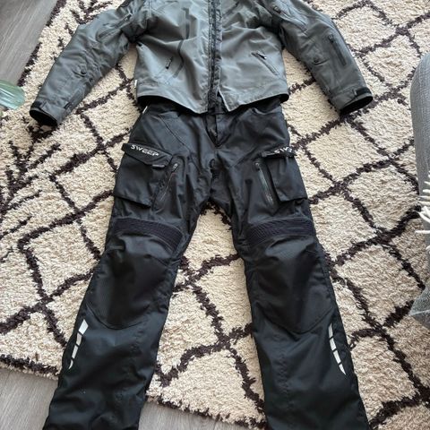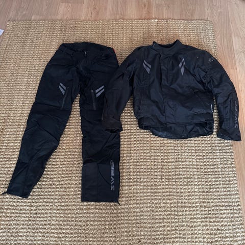 Uutta vastaavassa kunnossa olevat Sweep Wolverine 2 -takki ja -housut, molemmat kokoa 140 cm. Takissa olka- ja kyynärsuojat ja lisäksi selkäpanssariksi hankittu Sweep SolidB2 CE-hyväksytty selkäsuoja. Takissa tuuletusaukot kainaloissa ja selässä, ja housuissa reisissä.