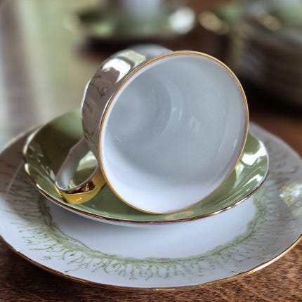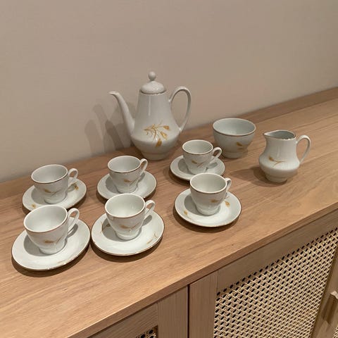 12 kahvikuppia ja lautasta, kermakko, sokerikko, 2 kaadinta,5 mukia, kulho, teekannu ja 4 tarjoiluvatia, ehjiä yht. 20 eur