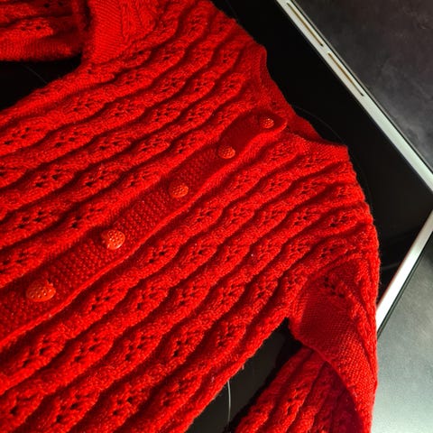 Myydään lasten itsekudottu villatakki. Vuodelta -70. Ei koko merkintää. Toridiili