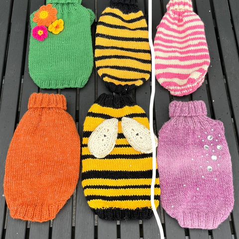 Itse neulottuja koirien villapaitoja (narttumalli) Selänpituus noin 22cm kaikissa!