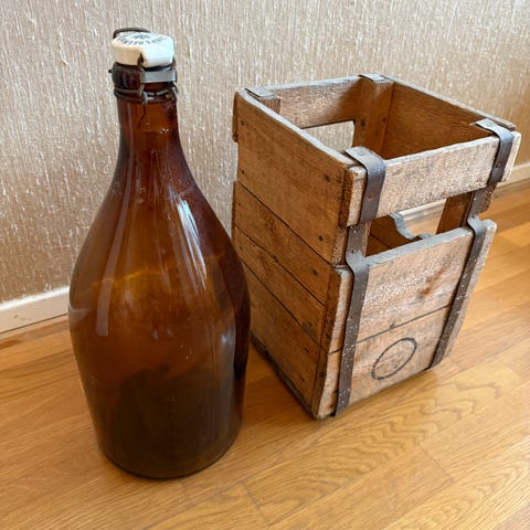 Myydään upea Pyynikin kaljatehtaan vanha lasipullo korissa (50-luvulta). Korkeus n. 50cm.