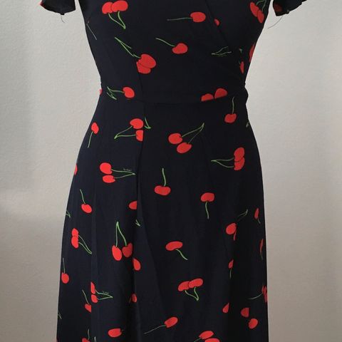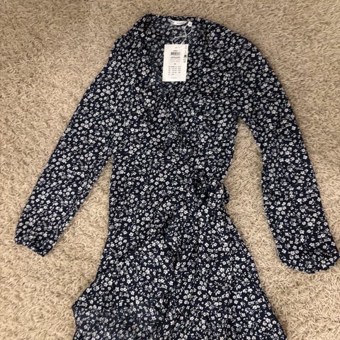 Vain kokeiltu, laput poistettu. Pohjaväri tummansininen. Kietaisumallinen, kaula-aukossa röyhelö. Kevyt ja ohut materiaali, ei näy läpi.