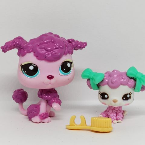 Kuvien mukaiset aidot ja hyväkuntoiset Littlest pet shop koirat. Pinkki puudeli emo ja sille kuuluva pentu. Mukana alkuperäiseen settiin kuuluva peili + ruokakippo ja luu.