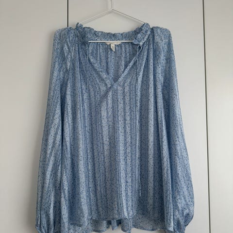 Flowy blouse / shirt / top with black background and white flowers. It has a stylish black jersey collar and buttons on the back. Nice to the touch, classy and elegant shirt. Perfect condition, like new. It has 3/4 sleeves.