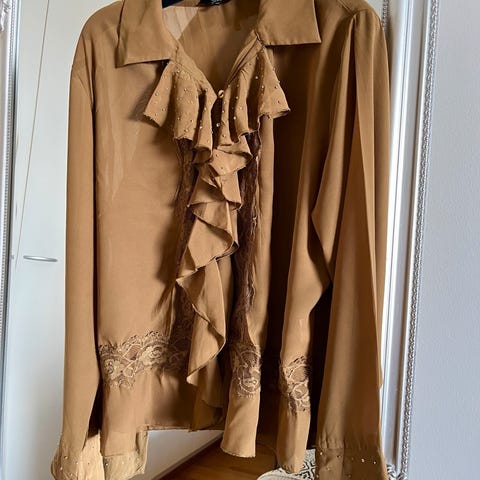 Myydään ihastuttava musteenharmaa röyhelöpaita. Erittäin näyttävä.