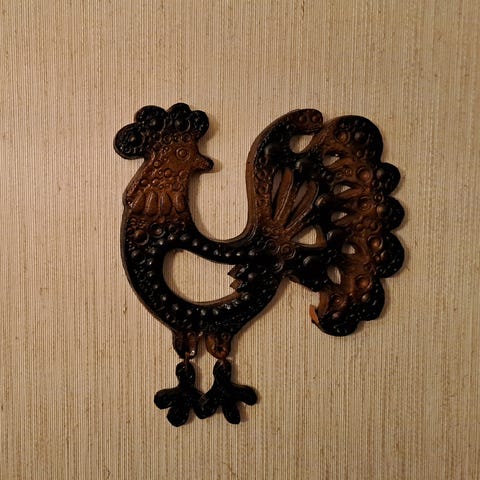Keraaminen ruskea kukko. Korkeus on 30 cm ja leveys 17 cm.