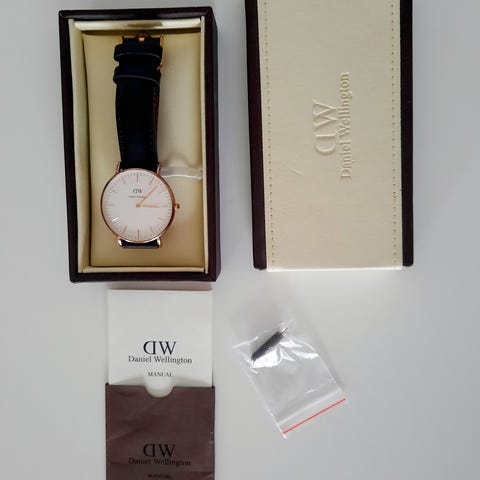 Lähes käyttämätön, ei naarmuja Daniel Wellington Classic kello mustalla nahkahihnalla. Kellon hihna käy naisille ja miehille, jolla on kapeampi ranne. Kellotaulun koko on 36mm.